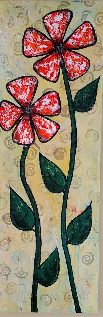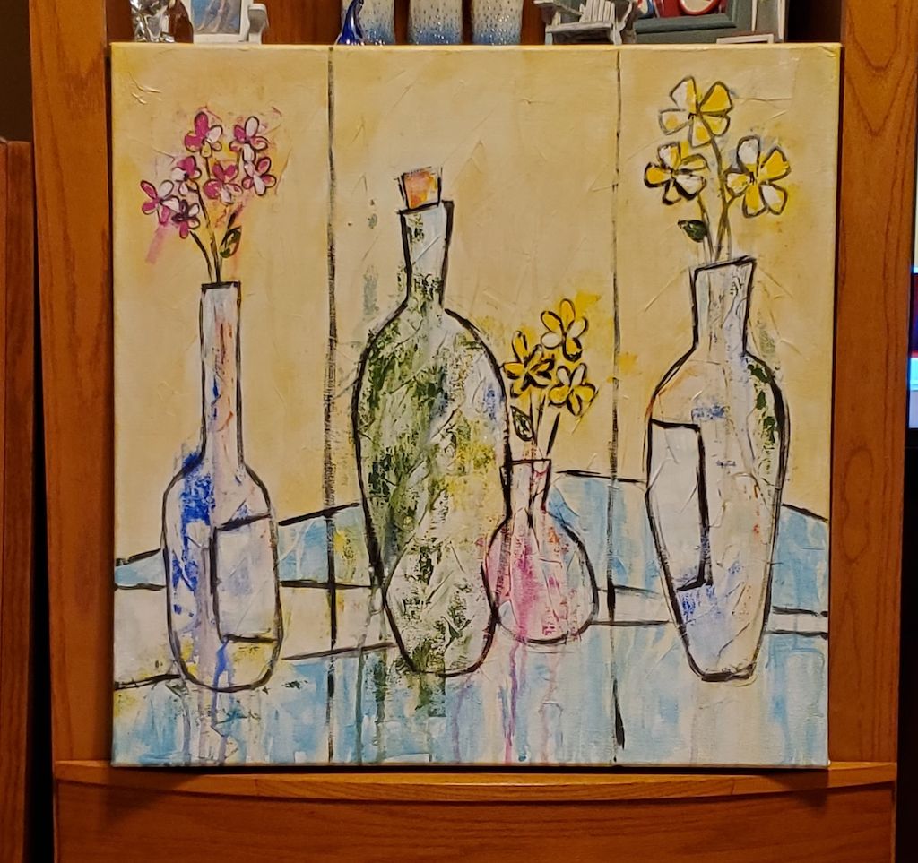 In my personal work, I find myself being affected by events of the world, my life, and those around me, even though they do not become the focus, nor is my art a literal illustration of such things. I usually begin with a rough idea of an image in my head and have already determined what medium would best to use. But when I begin the actual work, when I get dirty, I work spontaneously, not fully planning everything but allowing the image to evolve and emerge throughout time. At some point, especially when painting, the image itself seems to take over. It is not uncommon for me to work on a piece for a while, then stop. Then spend time, perhaps days, “in conversation” with the canvas. (It is those times when my husband, Bill, may come in and ask if I am OK. I tell him “I’m just listening.”) At some point, I will take it up again adding the final touches needed to deem it finished. “I am reminded of a Peanuts cartoon, in which Charlie Brown describes his drawing as the pencil doing all the work, he is just riding it.