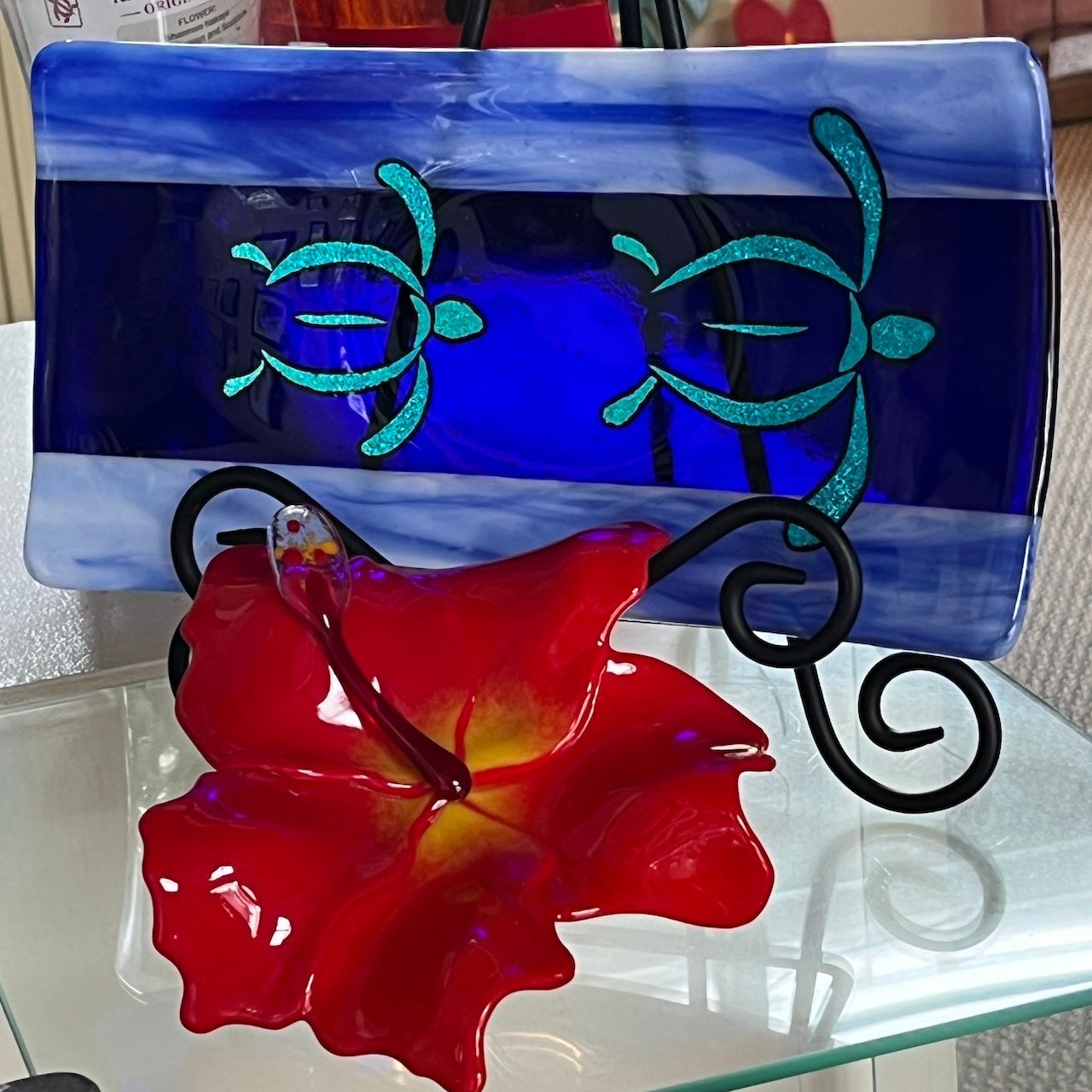 Tamisha did not stop there. Realizing that her abstract blend of colors and different shades of a color melded like watercolor paints might, she conceived to use her monstera leaf mold as a type of canvas for creating images with fused glass. This opened a window to infinite creative expression. Sunsets, volcanoes, bird of paradise, and silhouettes of palm trees in the light of the moon have been added to her monstera collection, and there will certainly be more to come.