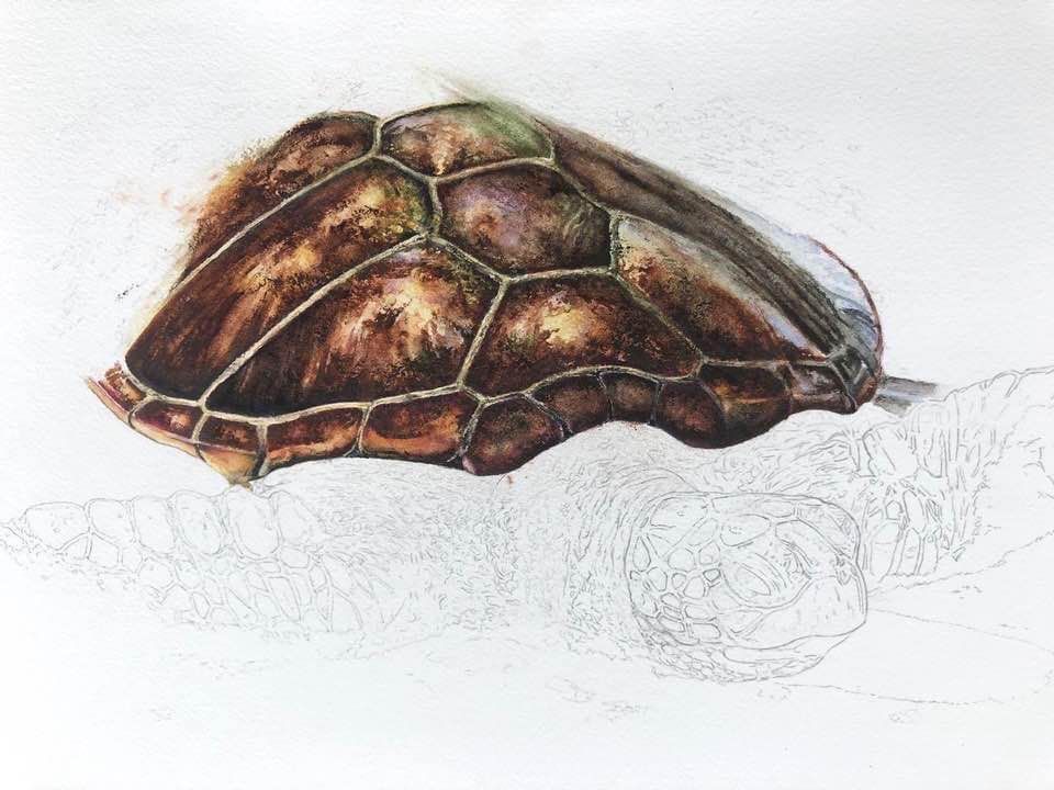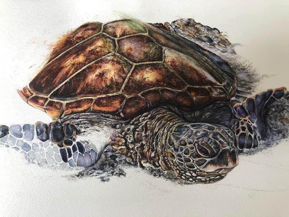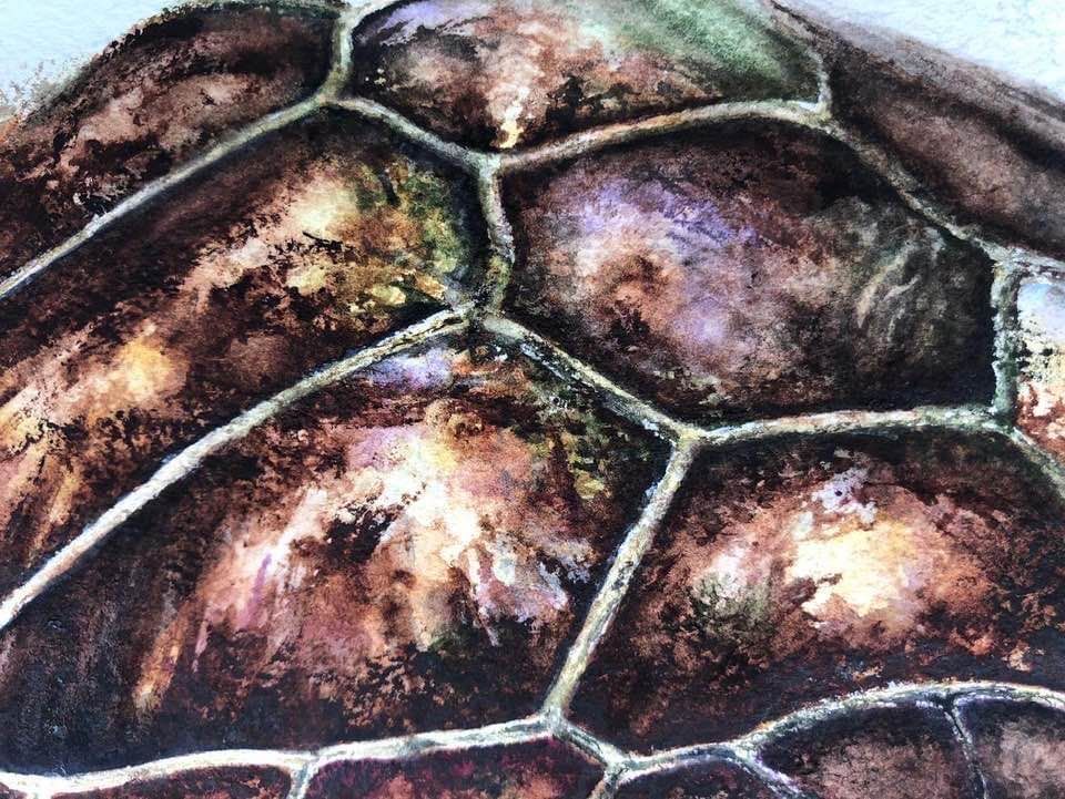 Here are some close-up images of some watercolor honu shells painted by Geer. "I usually incorporate many details, colors, and textures in my paintings. I’ve also included an image from a new, work-in-process honu watercolor painting. The new painting is challenging because the honu is partially submerged. The top portion of the shell protrudes through the surface of the water but the majority of the shell is underwater."