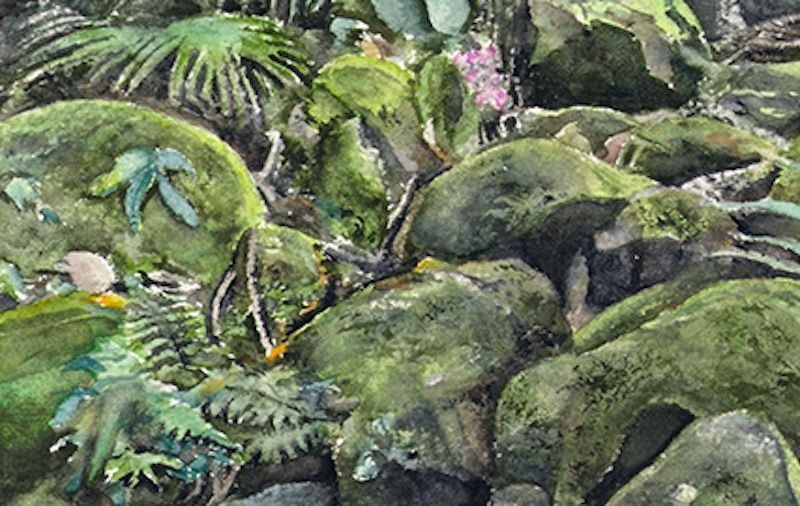 Whenever Ken Geer visits the Old Kona Airport Beach, he's always drawn to Shark Fin Rock, a distinctive lava formation. Here is his watercolor painting of Shark Fin Rock. "I didn’t paint all of the rocks but I think I got most of them. I used wet-into-wet painting and dry brush painting techniques to create the color blends and various textures in the rocks."