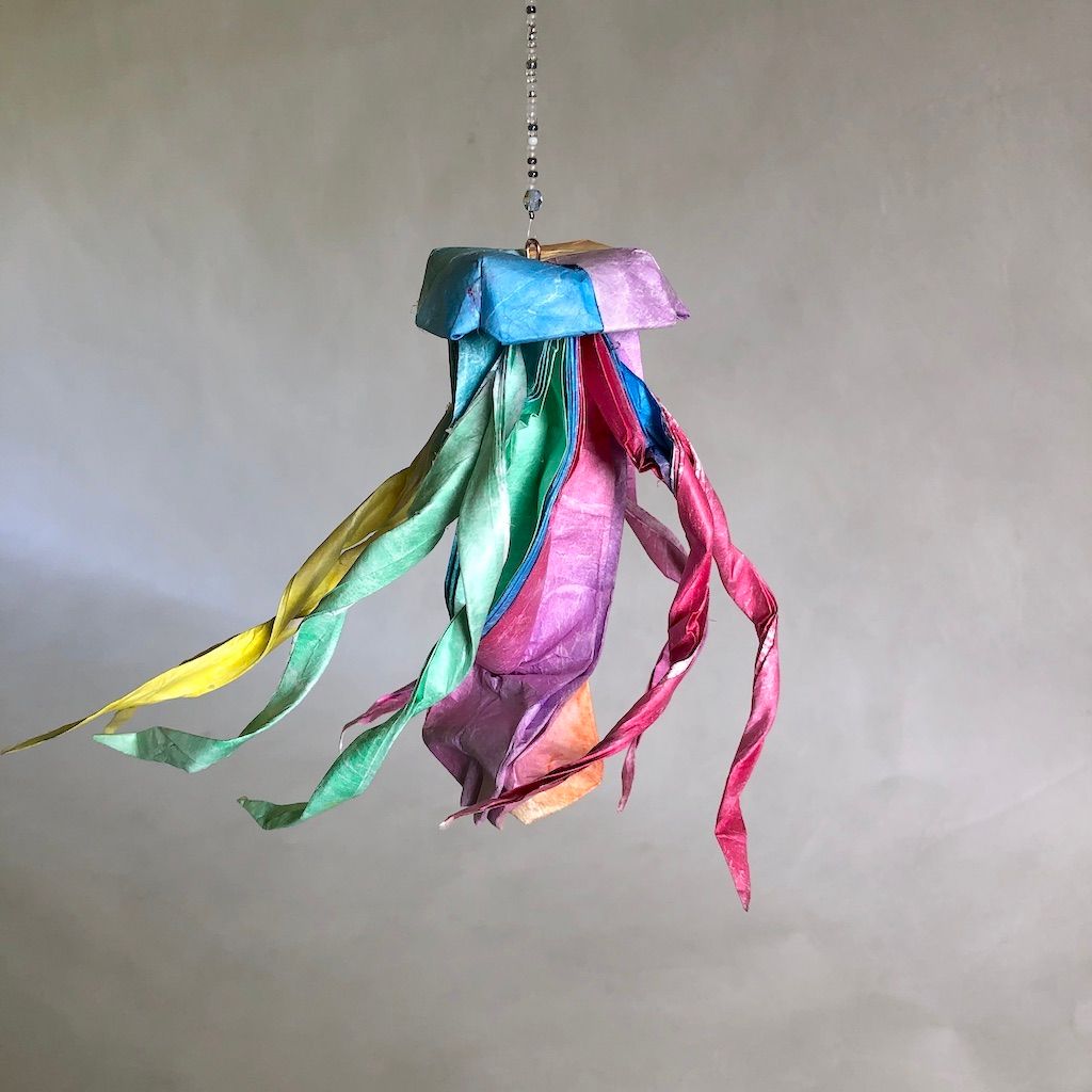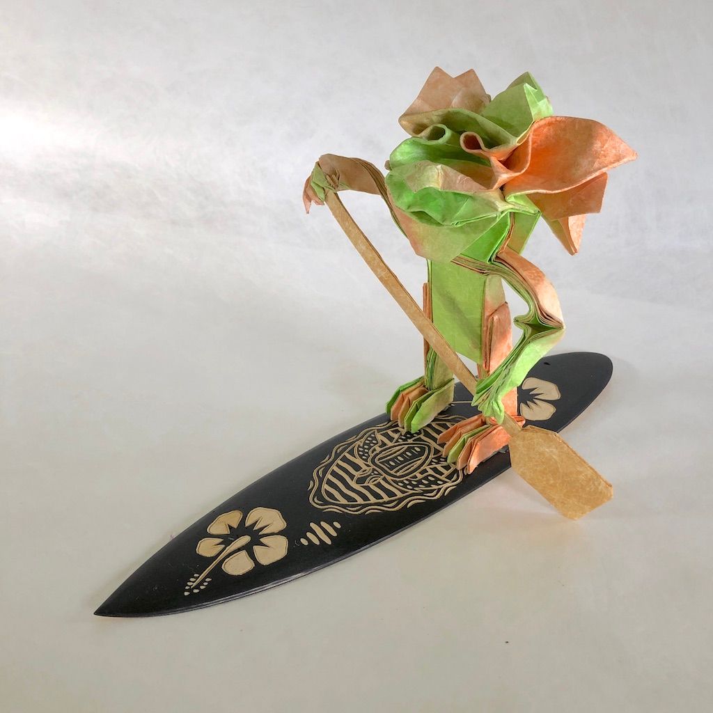 Other creatures, like her large dragons and mo’o (lizards) and menehune are designed from a technique called box pleating. To make these, Shannon makes accordion folds in one direction, and then does the same perpendicular to the first folds, and then again diagonally. This allows Shannon to expand certain areas and contract others, creating shape. It also allows her to create scales, which adds texture. Creating a library of different folds, almost a language of folds, is what creates the personality and unique nature of each piece. Creating a head or face using a particular set of folds allows her to sculpt a range of facial expressions. Similarly with folding a body and sculpting it into different positions. In this way, she is able to give life to her pieces.