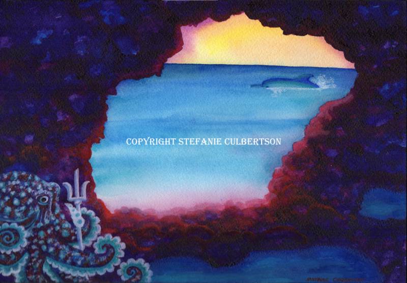 In her painting “He’e and Nai’a – After the Storm” (first painting below), Stefanie delves into mythology as well. She started with the background of her painting, the cave looking out onto the calm, peaceful ocean, after a rip-roaring storm. (She reflected on the growth, change, and healing she had experienced this past year.) She was inspired to paint the He’e (octopus), beginning her research, she was amazed to how deeply the beliefs, legends and mythology about the octopus run throughout all the cultures in the world. In the Hawaiian creation account, the “Kumulipo”, the octopus is the “lone survivor from an earlier world”, a type of alien, and the last of its kind living on Earth. Seeing the He’e in water symbolizes good luck to Hawaiian people. The octopus is found in all ocean systems on Earth and traces back 30 million years. The ancient Mediterranean cultures gave tremendous respect for the octopus and worshipped it in ceremonies, leaving offerings for safe sea journeys. It has been referred to as “an eight legged sea monster” or a “devil fish”, by Native American accounts. The He’e is extraordinary in its intelligence and capabilities to camouflage itself, to appear and disappear. It has marvelous defense mechanisms, the expulsion of ink, confusing its attackers and its agility (being a mollusk) to slip through even the tightest of spots. The octopus symbolizes enlightenment, creativity and flexibility, i.e. the spiraling of its limbs, the path leading from the outer consciousness and materialism to inner soul illumination. Also in the painting, the Nai’a (dolphin) is swimming past the cave, delighting in the new dawn and calm sea. The Octopus is holding the trident. (It is Poseidon’s trident in Greek mythology). However… the artist leaves the interpretation and personalization of this painting to the viewer.