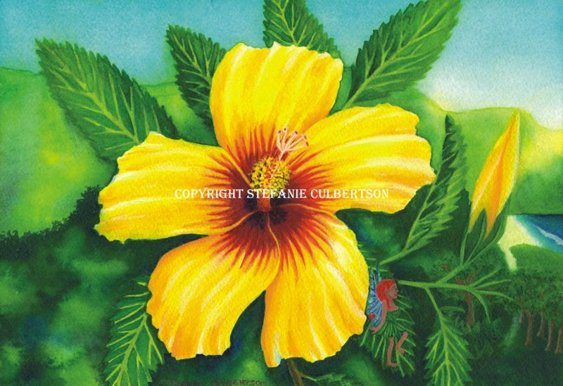 Stefanie Culbertson has been painting with watercolors since she moved to Kona, Hawaii in 1989 as a teenager. It is her favorite medium and the Islands, their lush beauty and diversity continue to inspire her art. Growing up in the "Old World" in Germany she was immersed in art and theater. She built her foundation in various techniques as an art major in high school, and attended the Art Institute studying various techniques. At the same time, she studied acting techniques at a professional theater as well. She continued her studies in both media when she came to Hawaii, attended Hawaii Community College, and studied The Meisner Technique with Jim Jarrett in Waimea. Stefanie went to California for eight years. She worked and performed on and off stage and camera in many productions and continued with her art. During her time in California, Stefanie earned her AA Degrees in Liberal Arts and Drama, and her BA Degree in Digital Design.